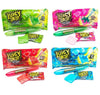 Display box includes 16 Juicy Drop Pops Taffy Candy Packs, each with about eight pieces of Juicy Drop Taffy and one tube of sour candy gel.