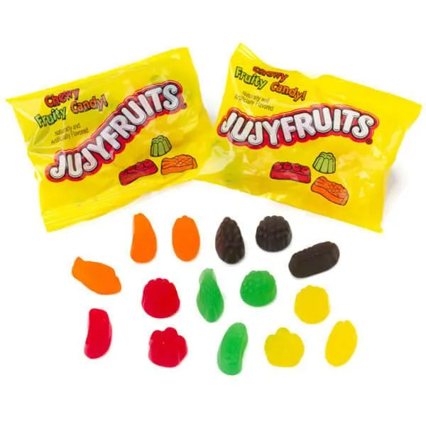 Even though JujyFruits come in five flavors: raspberry, lemon, lime, orange, and anise, the shapes of the individual candies are pineapple, tomato, grape bundle, asparagus bundle, banana, and pea pod. Hmmm...we aren't sure why, but one thing is certain: they taste fantastic! Trick-or-treaters will rejoice when you drop these fun packs in their candy sacks.