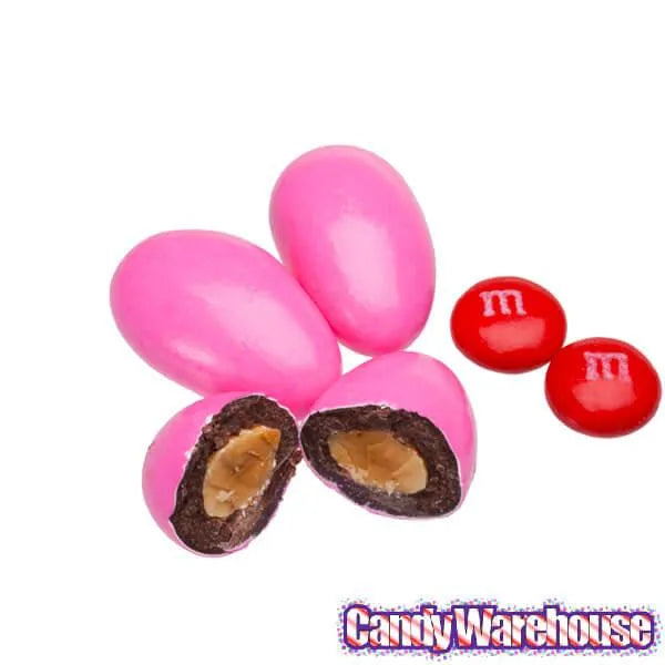 Plump, crunchy almonds surrounded by a thick layer of deluxe dark chocolate and a thin candy coating of bright pink color.