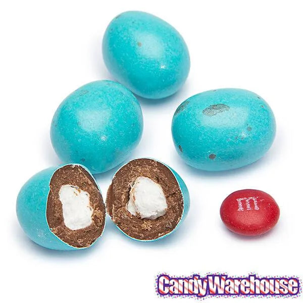 A delicate candy shell of pastel blue surrounds a rich milk chocolate egg with a fluffy marshmallow center. Each candy egg is speckled to look like a real Robin's egg!