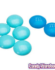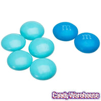 Gourmet milk chocolate ellipsoids coated with a thin candy shell of pastel blue! Each piece is about the size of a plain M&M's candy. The inset photo illustrates the comparative size and color of the two candies.