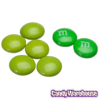 Gourmet milk chocolate ellipsoids coated with a thin candy shell of lime green color! Each piece is about the size of a plain M&M's candy. The inset photo illustrates the comparative size and color of the two candies.