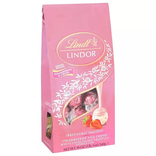 Bag contains 19 ounces of Lindt Valentine Strawberries and Cream White Chocolate Truffles.