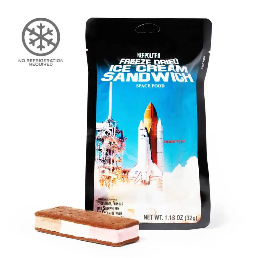 Experience your own personal space odyssey whenever gravity gets you down with a Luvy Duvy freeze dried Neapolitan ice cream sandwich. Now you can discover what dessert in space must’ve tasted like for astronauts on the early Apollo missions with this ready-to-eat space food that requires no refrigeration. Chocolate, vanilla, and strawberry flavors of freeze-dried ice cream are sandwiched between two rich chocolate wafers for an out-of-this-world sweet novelty treat. Send the aspiring astronaut or astronomer in your family over the moon by using the freeze-dried Neapolitan ice cream sandwich as a birthday party favor. The individual package also makes a fun Christmas stocking stuffer and Easter basket surprise. A colorful foil pouch featuring exciting space imagery enhances the authenticity and helps preserve freshness. Candy Warehouse gives you full permission to lift off and be the space cadet you truly are with LuvyDuvy’s otherworldly freeze-dried ice cream sandwich.