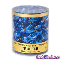 Acetate tub contains 30 pieces of Blue Foil Wrapped White Chocolate Filled Truffles Candy.