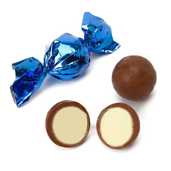 Gourmet milk chocolate balls filled with a smooth white chocolate. Each delicious truffle is wrapped in bright blue metallic foil.