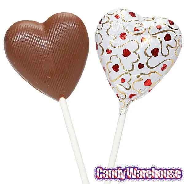 Solid milk chocolate molded heart shaped pops, wrapped in assorted colorful Valentine heart designs.