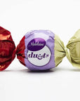 Display box contains 48 twist wrapped Duets White Chocolate Ganache & Raspberry Jam Filled Milk Chocolate Truffles.
