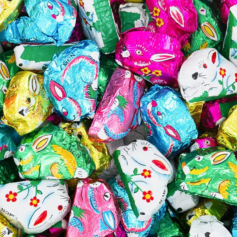 Box contains 5 pounds of Foiled Milk Chocolate Mini Sitting Easter Bunnies.