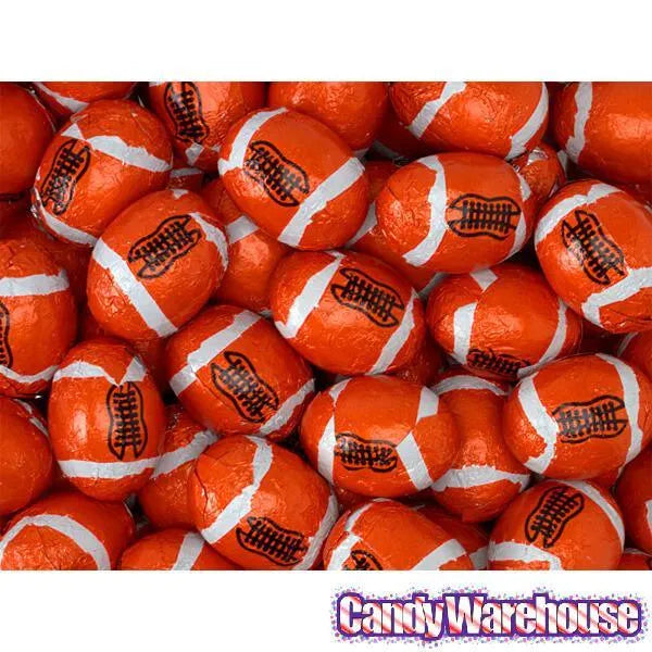 Bag contains 5 pounds of Foil Wrapped Milk Chocolate Footballs Candy.