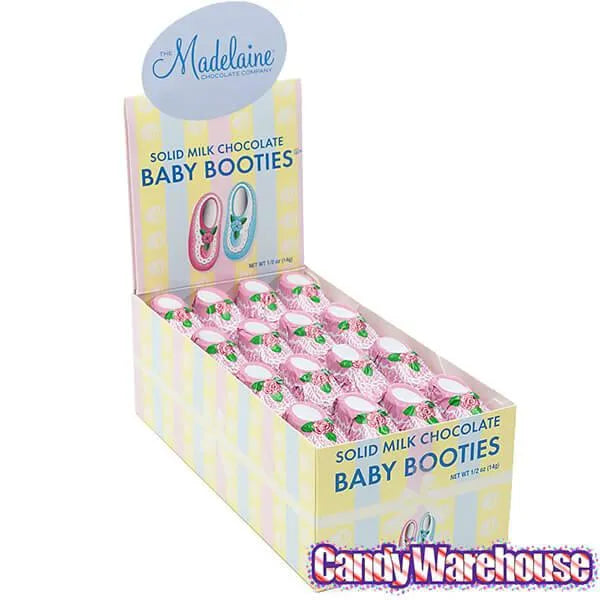 Display box contains 64 Pink Foil Wrapped Milk Chocolate Baby Booties, each with a net weight of 0.5 ounce.