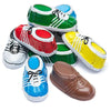 No odor-eaters required with these colorful foiled milk chocolate sneakers... cute sneaker treats that smell sweet and chocolatey, and taste even better. Designs include five bright colors: Red, Blue, Yellow, Green, and White.