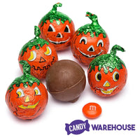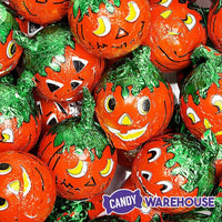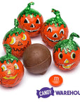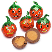 Molded milk chocolate balls filled with creamy, smooth peanut butter, and then wrapped in four different orange jack-o'-lantern face pumpkin foils. Perfect for Halloween party favors!