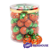 Acetate tub contains 40 Pumpkin Foiled Peanut Butter Filled Milk Chocolate Balls, each with a net weight of 1/2 ounce.