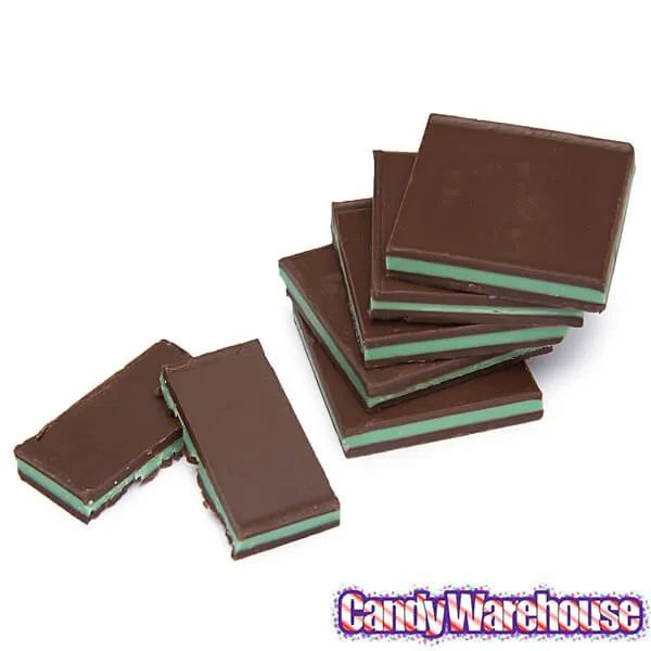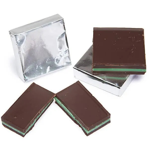 Scrumptious chocolate mint wafer squares! A yummy green mint center, flavored with pure peppermint oil, is sandwiched between two layers of rich dark chocolate. Each chocolate is wrapped in Silver Foil.