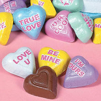 The grown-up version of candy hearts! Romantic phrases are printed on each brightly colored foil wrapper. The wrapper encases a yummy milk chocolate heart.