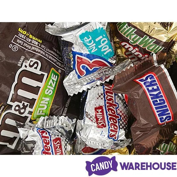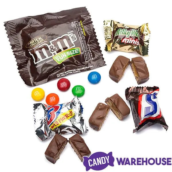 Assortment includes fun size Milky Way Bars, Snickers Bars, M&M's Packs, and 3 Musketeers Bars.