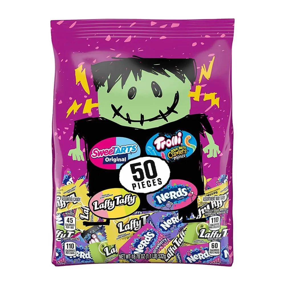 Halloween done right! Get your hands on this bag of Nerds, Laffy Taffy, SweeTarts, and Trolli yummy-ness: it's like a trick or treat bag of deliciousness! Whether you want to Frankenstein your treats, or add to your Candy Warehouse, this 50-piece bag will make the ghoul-est night of the year even sweeter!