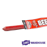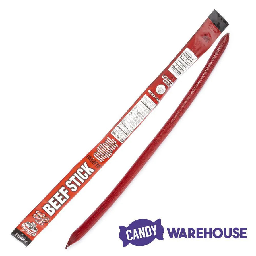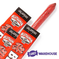 Tear open an Old Trapper jalapeno wrapped deli style beef sausage stick when you need a boost of high-protein energy to keep going. Delicious smoked beef pairs up with spicy jalapeno peppers to create a taste-bud-tantalizing snack that satisfies. Keep this 26-piece box of Old Trapper beef sticks on hand for late-night study sessions, kids' lunches, and long commutes that don't let you stop for a food break. Each of the individually wrapped jalapeno beef sticks is approximately 13 inches long, providing you with a mega meaty morsel that keeps you fueled up and fired up until your next meal. Candy Warehouse stocks a large assortment of high-quality meat snacks from Old Trapper, including circle-shaped beef jerky in several flavors and Peppered Jumbo Kippered Beef Steak. Yum!