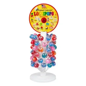 Make your countertop pop with the eye-catching Original Gourmet Lollipops Display, featuring 120 oversized lollipops in a tempting assortment of classic and unique flavors. Since 1994, Original Gourmet has been crafting peanut- and gluten-free lollipops, made right here in the USA, with smooth, long-lasting flavor and vibrant colors. Flavors include irresistible favorites like Strawberry Cheesecake, Piña Colada, Banana Split, Birthday Cake, and Orange Creamsicle—all wrapped in clear cellophane to show off their brilliant hues.