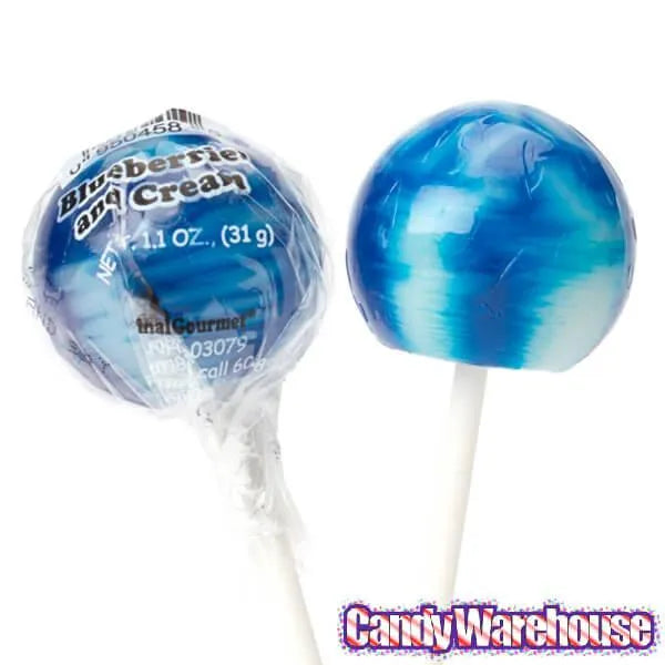 Native to North America, blueberries have performed many more tasks than just pleasing palates and looking pretty. Early colonists boiled the densely colored blueberry fruit bits with milk to produce grey paint, while Shaker societies mixed strips of blueberry skins with sage blossoms, indigo, and milk to give their homes their traditional blue hue. When you behold one of these gorgeous swirled lollipops you can see why! Indigo essences mix dreamily with creamy off white tones in each sphere, making these blue and white pops look just like a massive marble that fits perfectly in your mouth. As you unwrap one of these super sweet treasures, notice how shades of light blue intensify into royal blue tones before giving way to sapphire deepness. Each pop has a unique eye-pleasing pattern. The only thing better than the look of these scene-stealers is their scrumptious flavor. Hear your taste buds sing as this lollipop's ultra sweet berry tone overcomes them, balanced out by a smooth, rich, and creamy wave of flavor. The entire ball is smooth like glass...as if tailor-made for your mouth. If you're looking for a candy that is as lovely to snack on as it is to look at, look no further than these artful blueberries and cream lollipops. Prepare yourself for sensory overload!