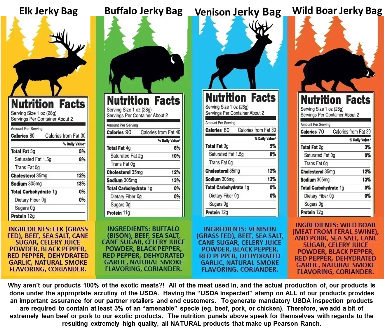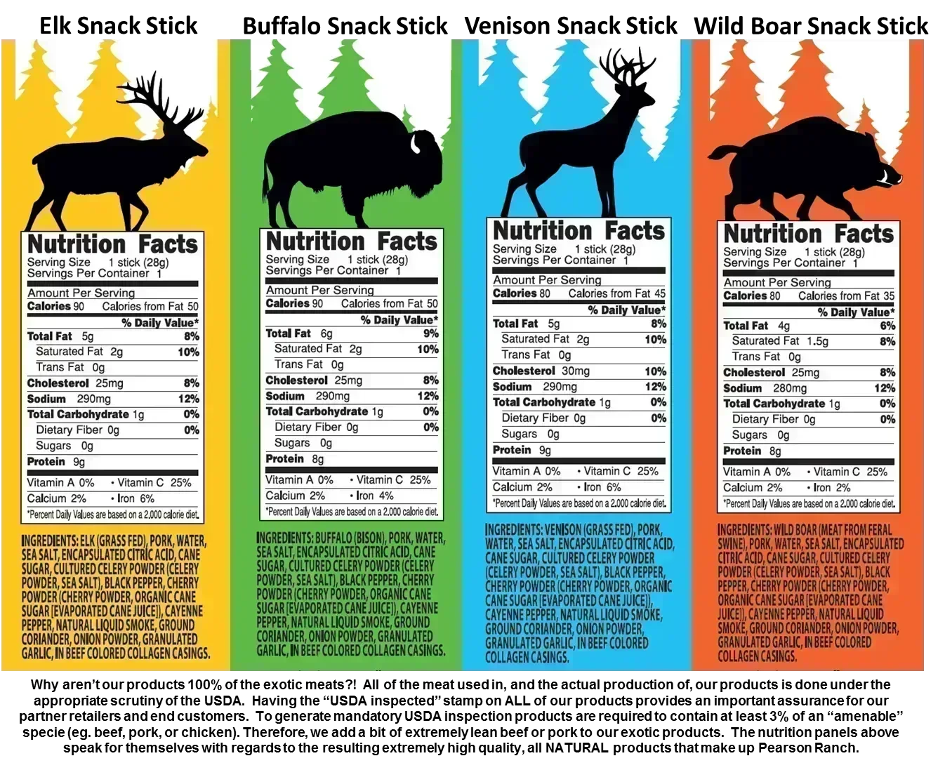 Frequently asked question: Why aren't your exotic products made with 100% of the exotic meat? Answer: We want all of the meat we use, the production processes used to create the products and the labels we use (nutrition panels and claims on packaging) to be fully inspected by the USDA and in turn for all of our products to proudly carry a "USDA inspected" stamp. USDA inspection provides an important assurance to our partner retailers and end customers. In order to get mandatory inspection by the USDA a product is required to contain at least 3% of an "amenable" specie (ie. beef, pork or chicken). Therefore, we add a bit of extremely lean beef or pork to our exotic products. Hope that explains why we do what we do. Don't worry, as the nutrition panels on our products attest, doing this doesn't affect the flavor or quality of products.