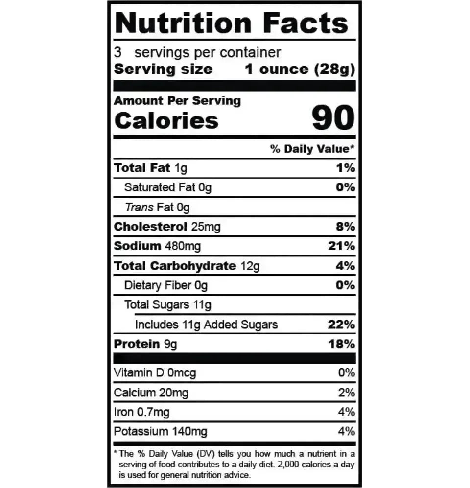 Ingredients: Beef, Brown Sugar, Water, Salt, Natural Flavor, Spice, Vinegar, Lemon Juice, Monosodium Glutamate, Sodium Nitrite.