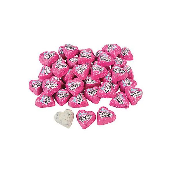 Bag contains 4 pounds of Pink Foiled Cookies 'n Cream Chocolate Hearts.
