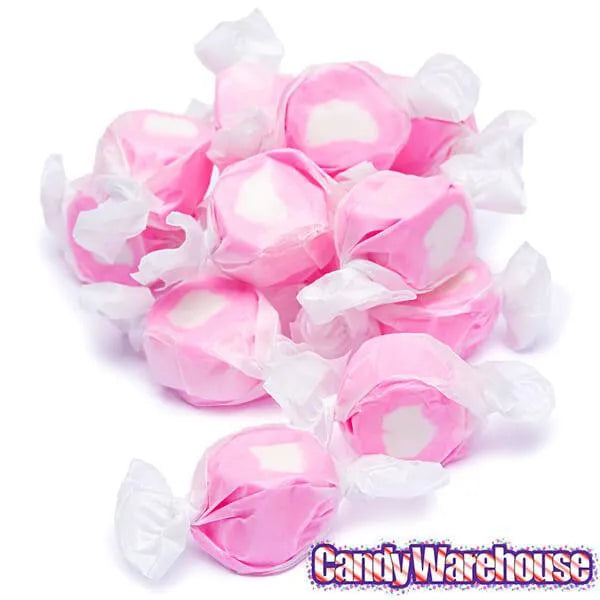Bag contains 3 pounds of Pink with White Center Strawberry & Creme Salt Water Taffy Candy.