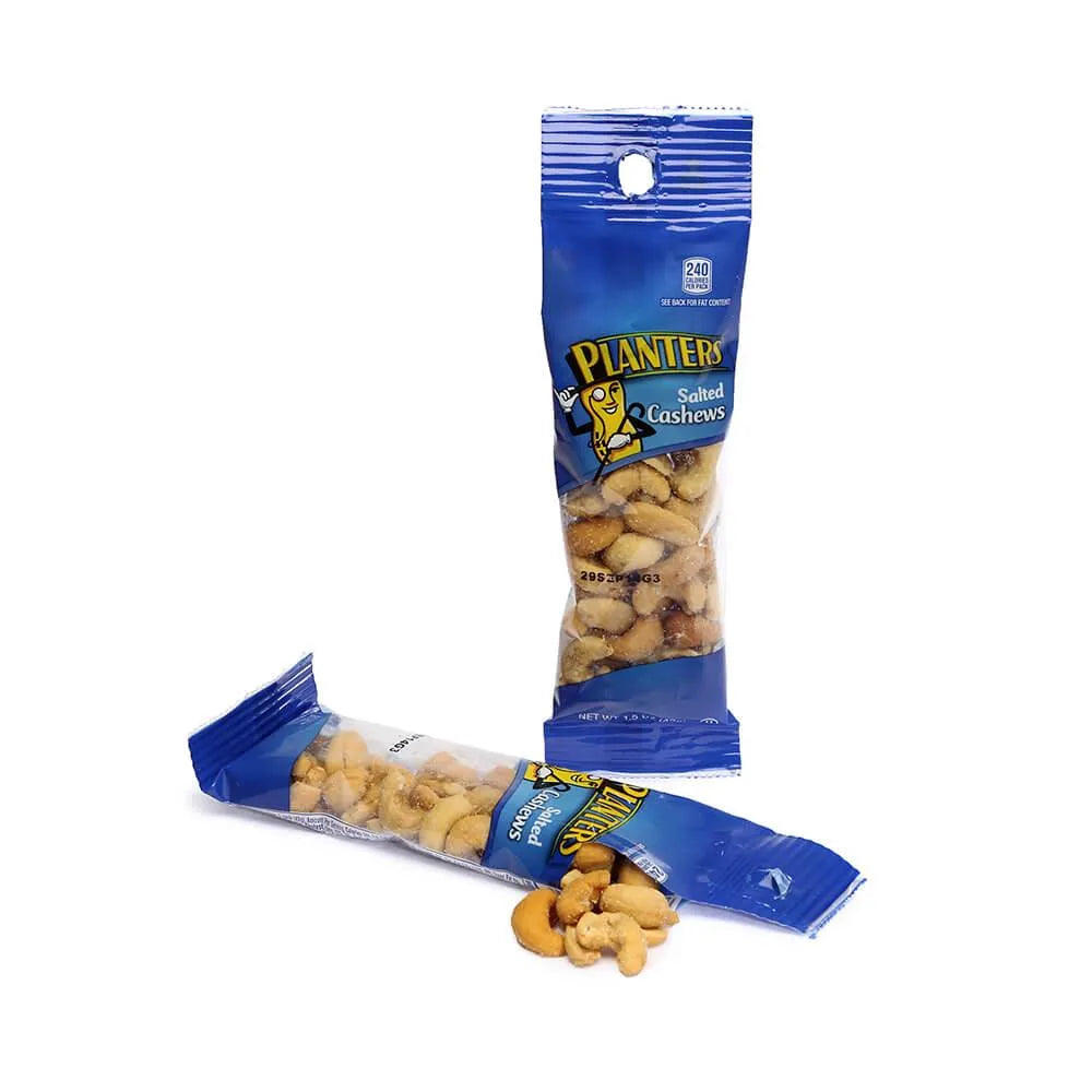 Display box contains 18 Planters Salted Cashews Nut Bags, each with a net weight of 1.5 ounces.