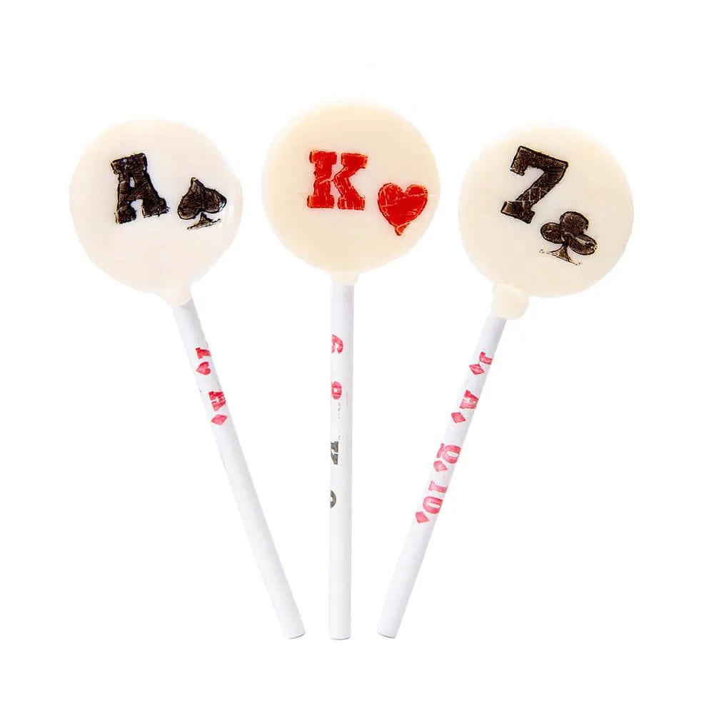 But what if we told you that you needn’t use cards in your poker tournaments at all? For a delicious twist on the classic card game, try out these Poker Pops! Deal every player five lollipops -- each white sucker has a different suit and card decorated right onto the surface. Now begin play as usual, but just try to keep a straight face once you smell the delicious pineapple aroma!