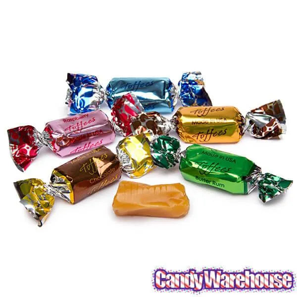 Bag contains 5 pounds of Assorted Metallic Foiled Toffee Caramels Candy.