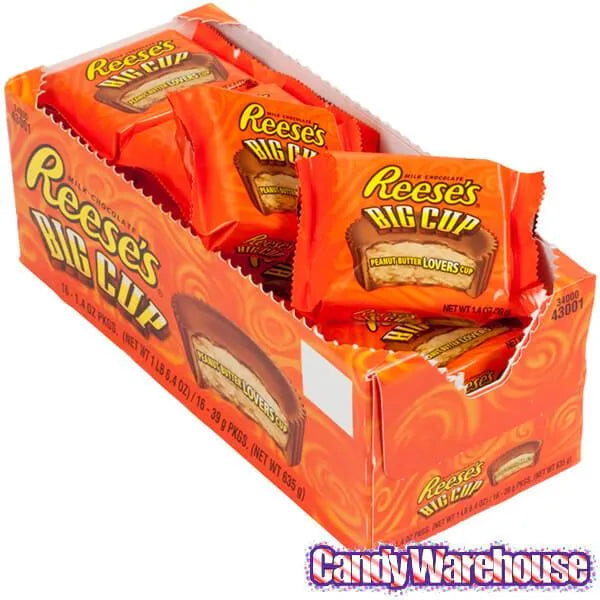 Display box contains 16 Reese's Peanut Butter Big Cups Candy Packs, each with a net weight of 1.4 ounces.