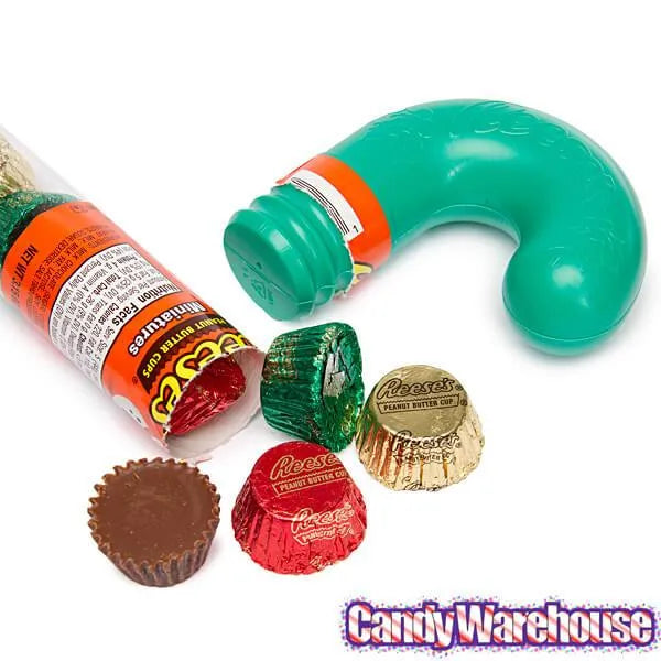 Plastic candy cane tube contains 2.17 ounces of Reese's Peanut Butter Cups Miniatures.