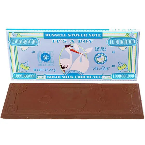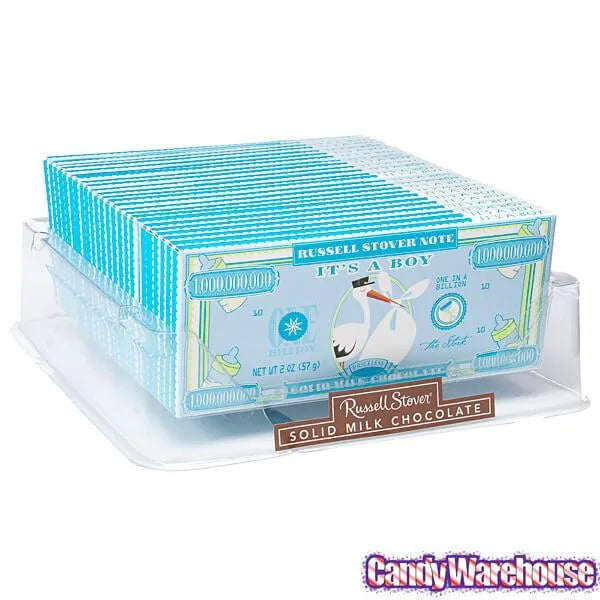 Display box contains 24 It's a Boy Russell Stover One in a Billion Dollar Chocolate Bars, each with a net weight of 2 ounces.