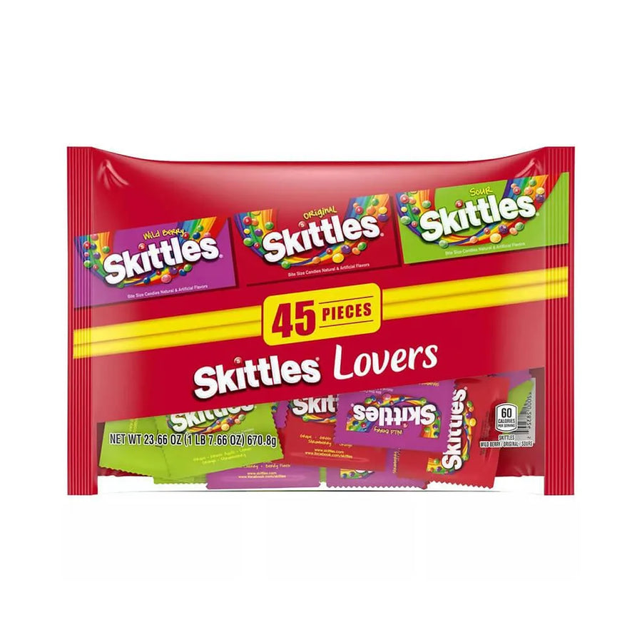 Bag contains 45 Skittles Candy Assorted Fun Size Packs.