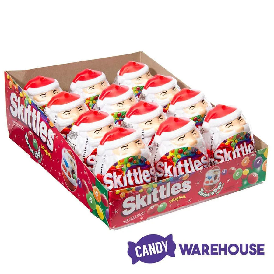 Display box contains 12 Santa Claus Twist 'n Pour Dispensers filled with 1.5 ounces of Skittles Candy.