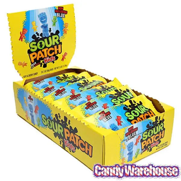 Display box includes 24 Sour Patch Kids Candy Packets, each with a net weight of 2 ounces.