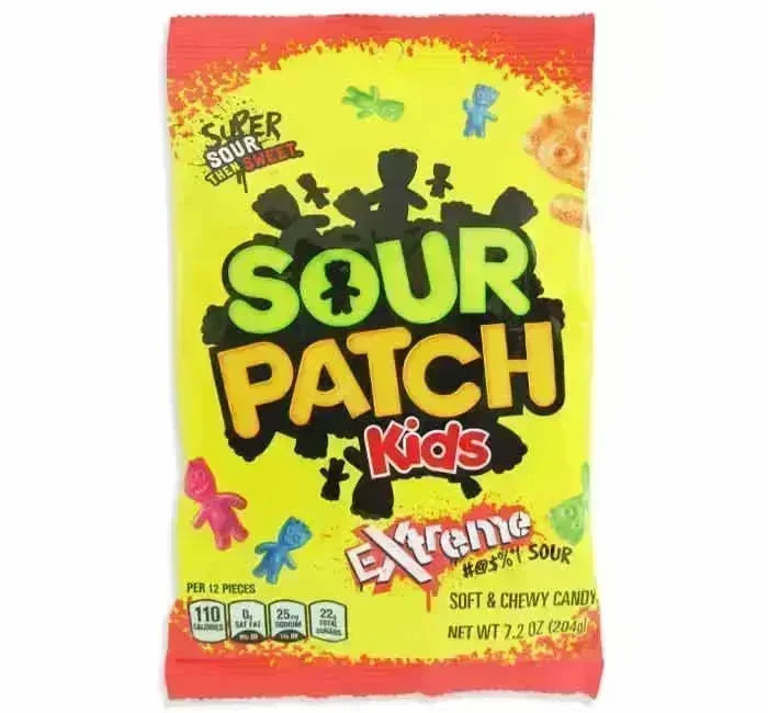 Sour Patch to the max! Totally extreme super sour flavors tingle your taste buds with every bite of these delicious chewy candies. Experience the power of Sour Patch Kids Extreme for the ultimate spine-tingling tangy flavor sensation!