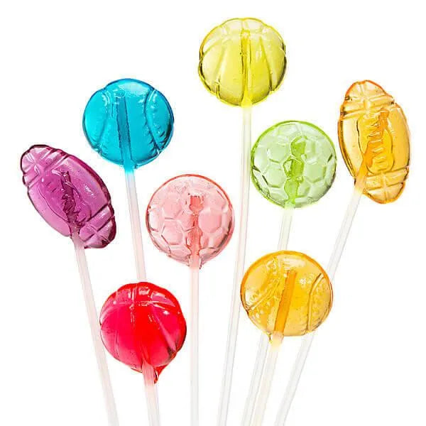 Bag contains 120 Assorted Colors Sports Ball Hard Candy Lollipops.