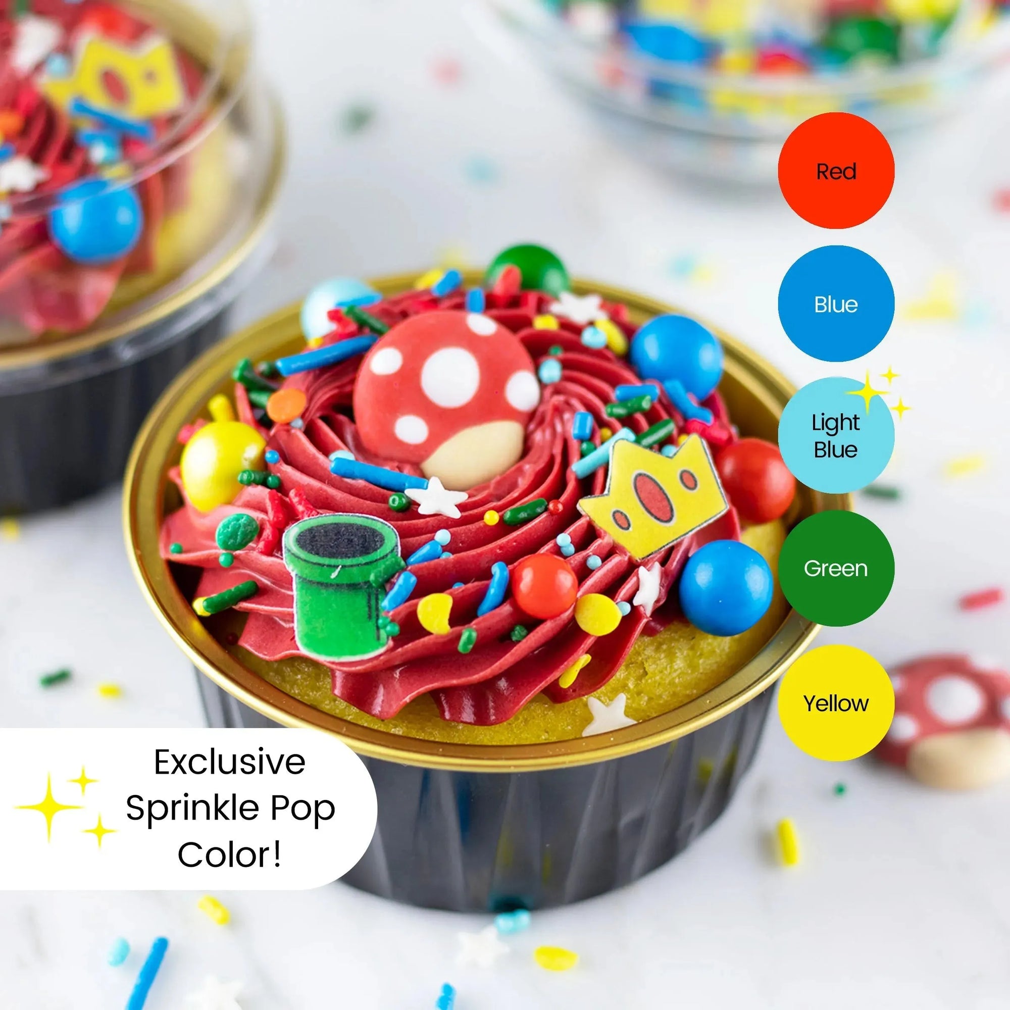 The highlight of this sprinkle mix are the adorable royal icing mushroom caps and wafer paper green pipes and princess crowns. They're the perfect addition to your baked goods for a fun and playful touch.