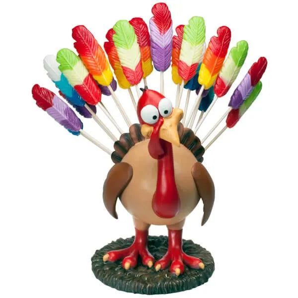 Behold the glorious Giant Turkey with its exotic plumage - 96 hard candy lollipop feathers that come in 4 Fall flavors: Green Apple, Grape, Cherry, and Blue Raspberry.... just like the Pilgrims ate at the first Thanksgiving. These autumnal harbingers are cast in solid acrylic and feature both a wattle and snood (fun turkey factoid: the snood is the fleshy protuberance that comes out the top of the beak). Sitting at the Thanksgiving Day kids table just got way more fun! Order yours and start gobbling today.