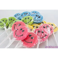 Fun hard candy lollipops in assorted colors with black icing happy face designs. Each pop is wrapped to seal in freshness.