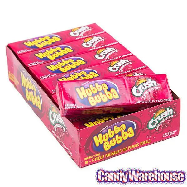 Display box contains 18 Strawberry Crush Hubba Bubba Bubblegum Packs, each with 5 pieces of gum.