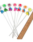 Here comes the sun . . . and the sunflowers! You can bundle a bouquet of beautiful sunflowers with a pretty bow – and then eat them. These cute lollipops are shaped like miniature sunflowers and placed on long, flexible sticks. They’re brightly colored, refreshing, and yummy! Use them as decorations, gifts, and favors at parties and events. The total length of these lollipops is about 12 inches and each sunflower is individually wrapped with cellophane. Assortment includes 7 translucent colors and fruit flavors: