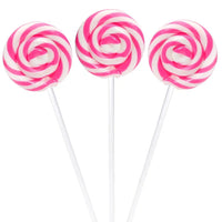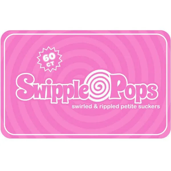 Resealable tub contains 60 individually wrapped Pink Swipple Pops Petite Swirly Ripple Lollipops.