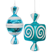 Want to have the sweetest Christmas tree on the block? Of course you do! Help score that coveted title with this duo of over-sized ornaments. They’re real show-stoppers, so to be frank, you needn’t reserve these little beauts solely for the tree -- dangle them anywhere that strikes your fancy! From stairways and mantels to wintery window displays, these teal blue plastic ornaments look elegant in any nook. One is decorated with stripes, the other with swirls, and both shimmer in the light as they twist on their wires. They’re sure to brighten up any holiday party… just make sure no one tries to give ‘em a lick! Plastic doesn’t taste too great.