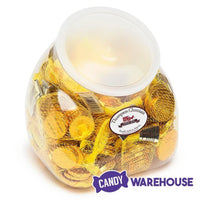 Tub contains 30 Hanukkah Gelt Gold Foiled Milk Chocolate Coins Mesh Bags, each with a net weight of 1 ounce.