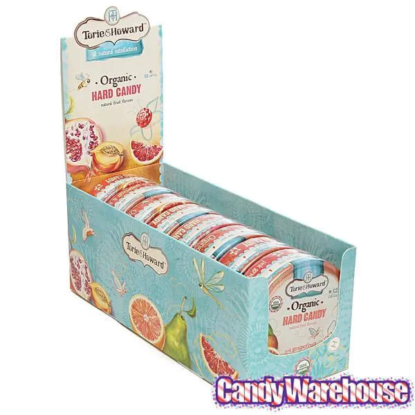 Display box contains 8 Pink Grapefruit & Tupelo Honey Torie and Howard Hard Candy Tins, each with a net weight of 2 ounces.