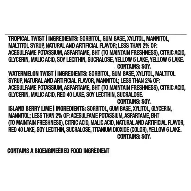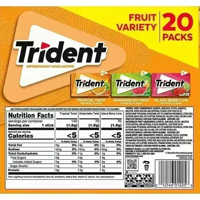 Enjoy fruity freshness with 20 packs of Trident Sugar-Free Gum, each loaded with 14 pieces of mouth-watering flavor! This Fruit Variety Pack brings you a trio of fan-favorite flavors: Tropical Twist, Watermelon Twist, and Island Berry Lime. Not only does this gum taste amazing, but it also helps clean and protect your teeth while keeping your breath fresh. Made with xylitol, this bulk pack is perfect for sharing or stocking up! (Packaging may vary.)